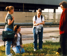 Loyola students, Sylvia Tracz, Kathleen Hannon, and Stephanie Marxer bag soils for led analysis under the supervision of graduate student Simona Dragan. Soils were sampled along gridlines originating at the location of the incinerator. The predominant wind direction was toward the northeast. Soils showed a Gaussian distribution (see below) of lead decaying with distance from the incinerator as predicted by air dispersion models. The highest soil lead content was over 4000 ppm. | |||||||