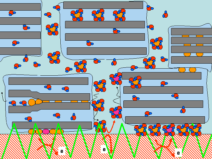 Figure 1. Coating clays onto an electroactive planar waveguide allows investigation of the clay film in several dimensions for two reasons. The electrochemical perturbation probes the entire diffusion sampled depth of the clay film. The optical signal probes only within the evanescent wave depth which is of the order of 100 nm. The optical signal is composed of two parts the steady state signal and the electromodulated signal. The electromodulated signal responds only to a probe molecule that is within the evanescent wave depth AND confined (non-diffusing) to that depth. The planar waveguide was built by Azza Wagdy.